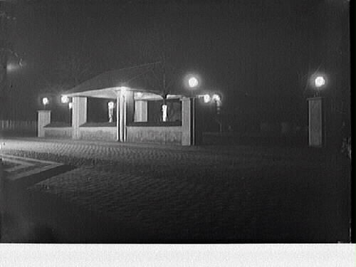 Kvällsbild av BP Bensinstation som låg utmed Kungsgatan, fastigheten Kv Magistern 7.