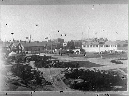Lantbruks- och industriutställningen i Varberg 1904. Bilden tagen mot söder. Till vänster syns Gamlebyskolan och till höger de tillfälligt uppbyggda utställningshallarna. Till höger nuvarande Östra Långgatan.