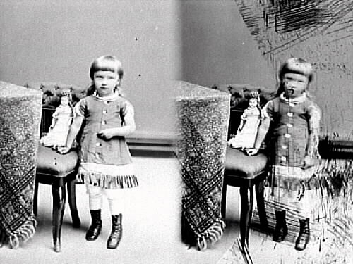 Flickporträtt. Troligen Wahlborg Ranch som föddes 1879. I stolen sitter en docka. Mathilda Ranch startade sin ateljé samma år som fotot togs, 1882.