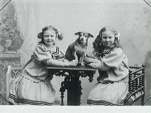 Barnporträtt. Flickorna Algren med en liten hund som sitter på bordet mellan flickorna.
