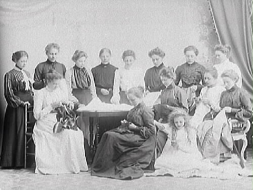 Ateljébild med en grupp kvinnor, samt en flicka, som syr. På bordet ett utbrett tygstycke. Eventuellt personal hos ett damskrädderi (Augusta Pehrsons?). Kanske reklamfoto?