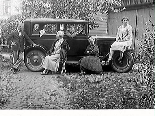 Familjen Wilhelm Ranch har kommit på besök från Göteborg. I bilens baksäte sitter Wilhelm, vid förarplatsen sitter sonen Uno Ranch, utanför bilen i pälsboa sitter troligen Agnes Ranch, bredvid henne, i mörk klänning: Mathilda Ranch.