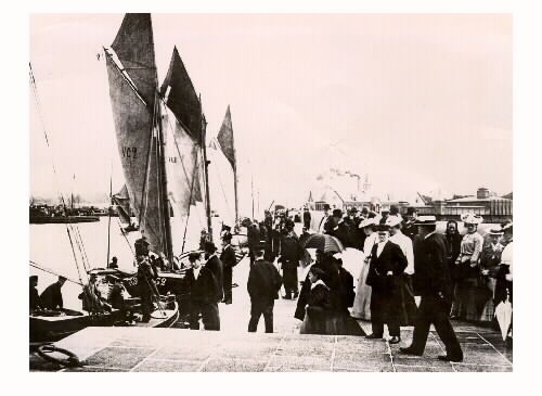 Hamnpiren i Varberg 1905, full av folk och segelskutor. Till höger i bild syns varm- och kallbadhusen.