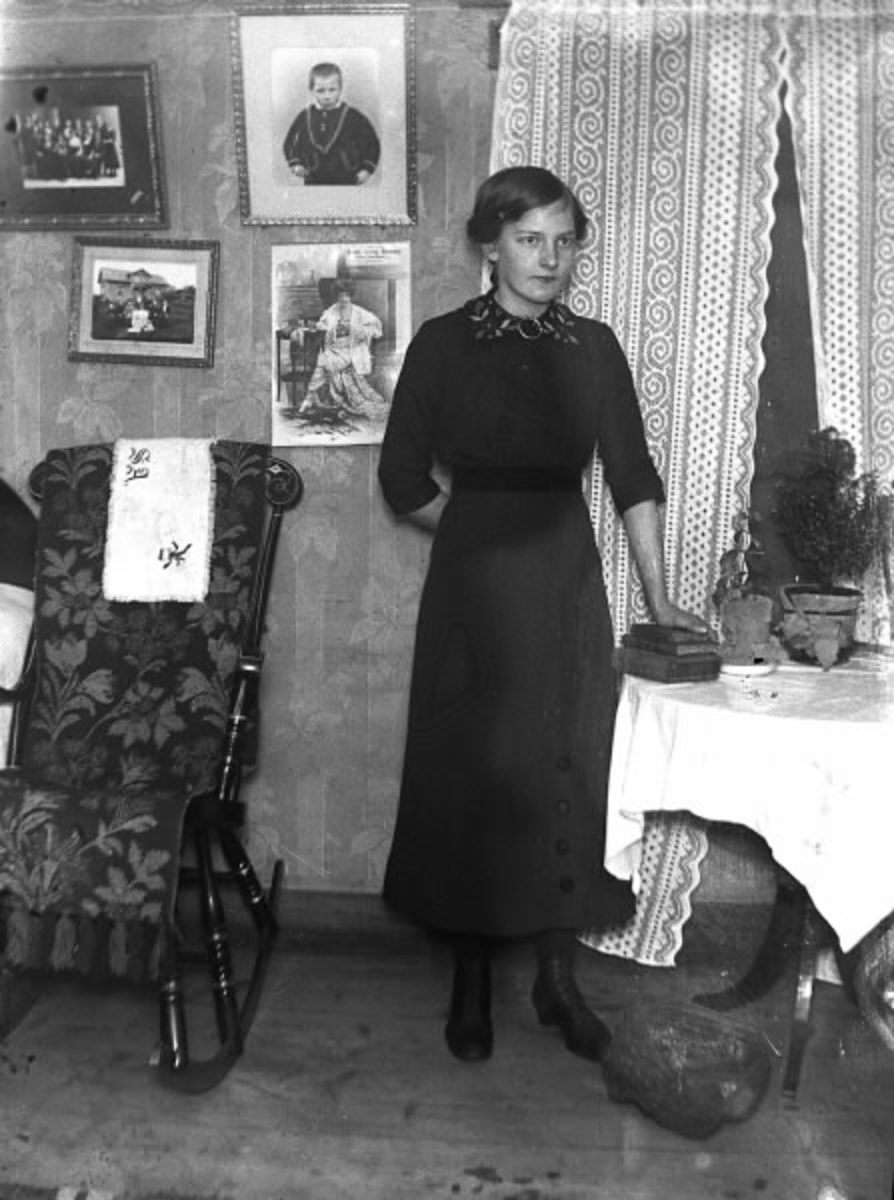 Kvinnoporträtt av en ung finklädd flicka som står bredvid en gungstol.