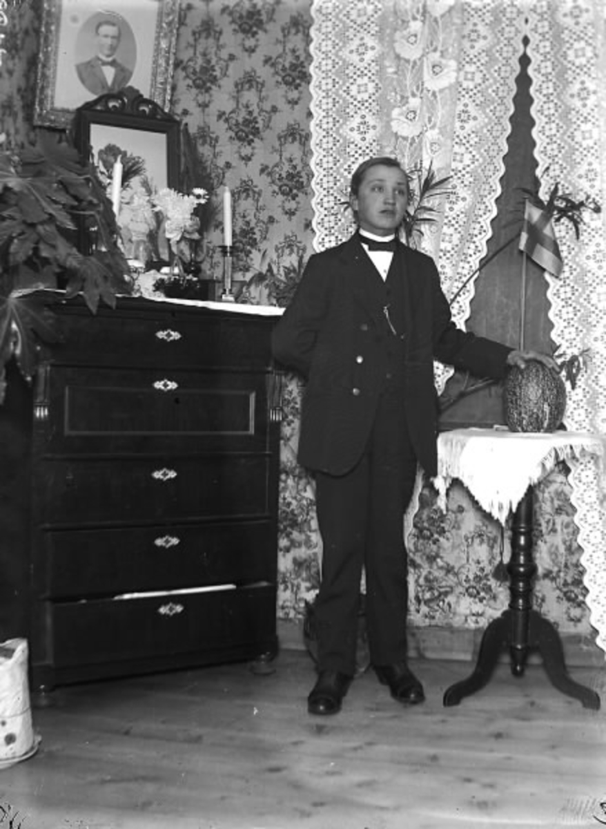 Mansporträtt av unge herr Georg Bertilsson inomhus bredvid en byrå och framför spetsgardiner. Hällhult.