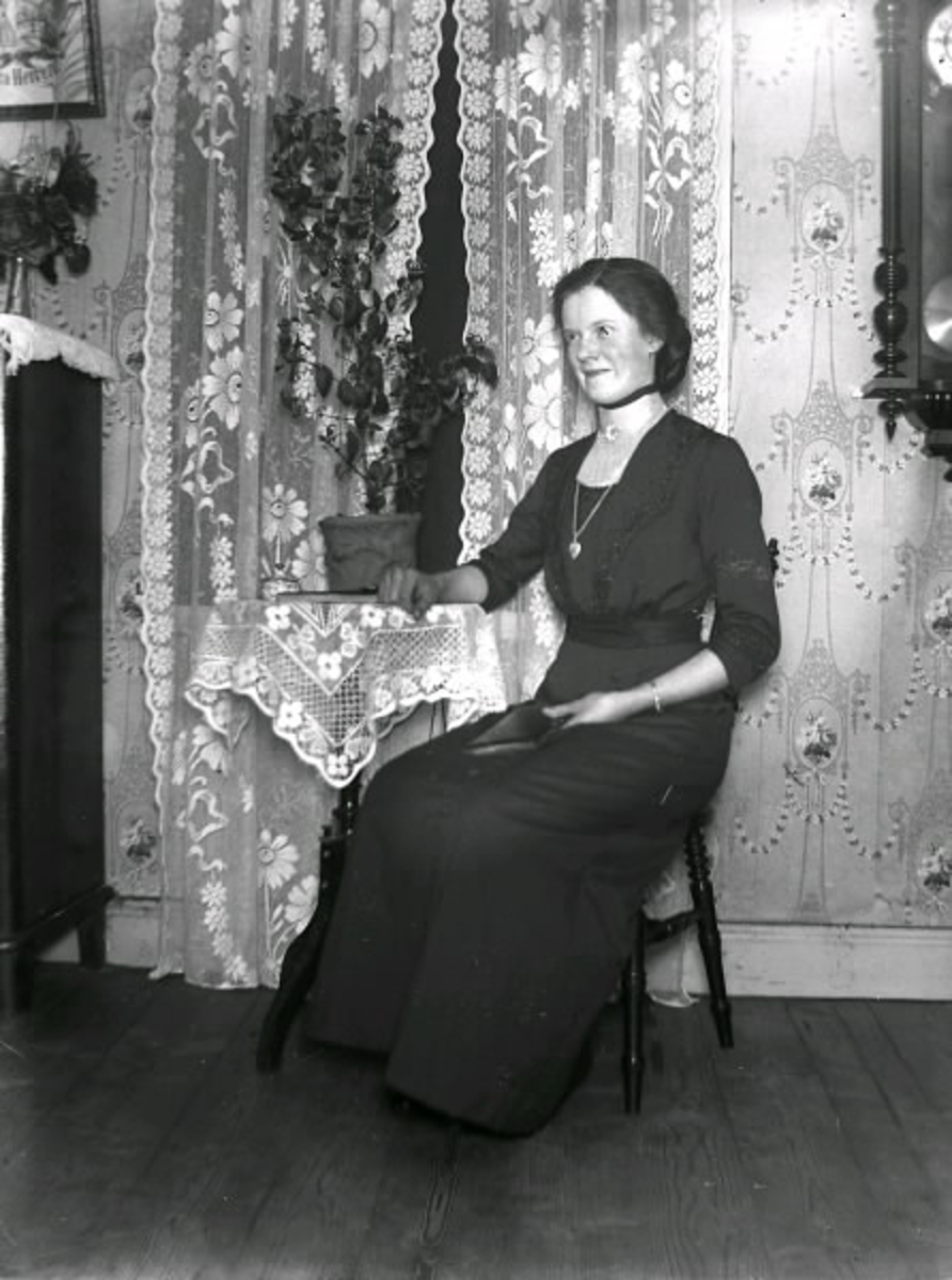 Kvinnoporträtt av Constance Bertilsson född Antonsson 1898 sittandes vid ett bord med vacker spetsduk framför etn spetsgardin.