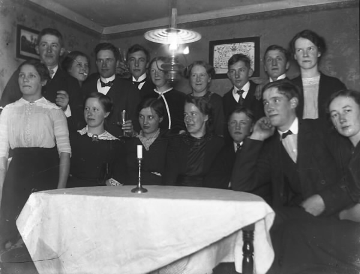 Grupporträtt av ungdomar inomhus vid ett bord med en tänd fotogenlampa.