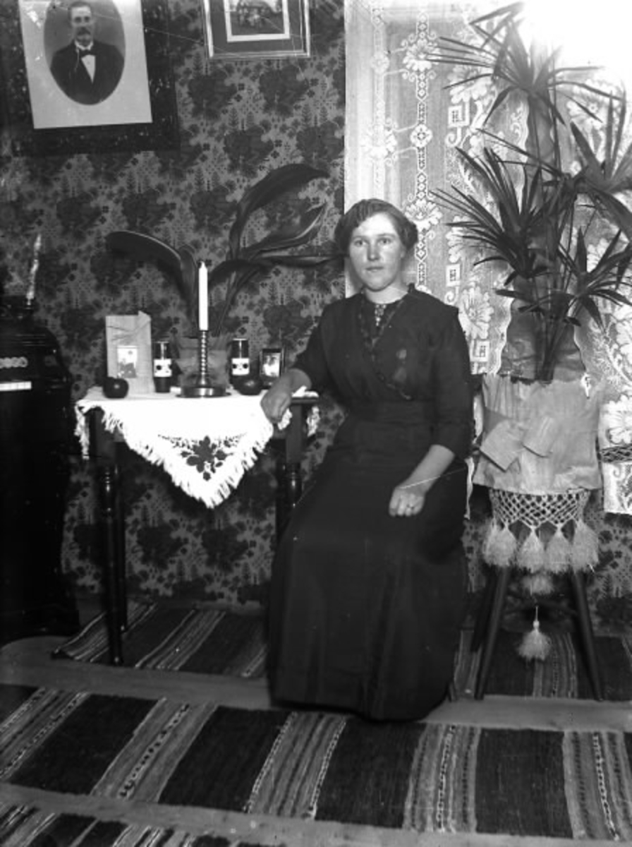 Kvinnoporträtt av Frida Nilsson Kjärrshult (?) Övra i inomhusmiljö sittandes vid ett bord framför en spetsgardin och trasmattor på golvet. På bilden syns också en piedistal. Kärrshult.