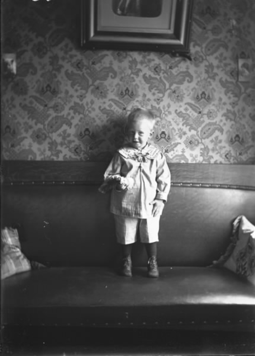Porträtt av en liten pojke (troligen Ivan Bengtsson) stående på en soffa.