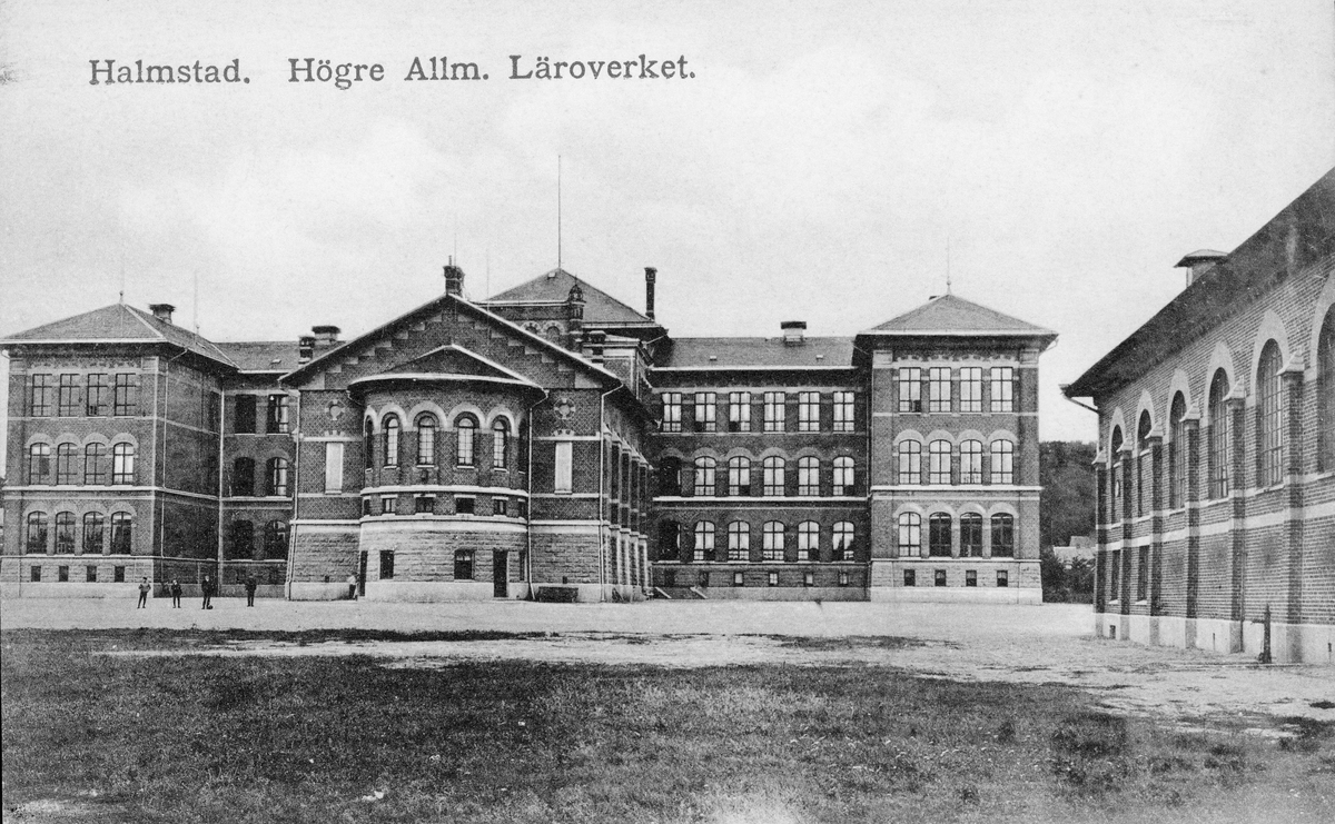 Vykort, "Halmstad. Högre allm. Läroverket." (text i rött), sett från skolgården. Skolan ritades av arkitekt Alfred Hellerström och invigdes 8 oktober 1906.