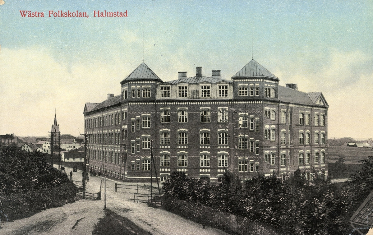 Kolorerat vykort, "Wästra Folkskolan, Halmstad", stämplat 1916. Skolbyggnaden ritades av dåvarande stadsarkitekten Sven Gratz (1864-1931) och invigdes 1908. Det sägs att Sven Gratz hade låtit sig inspireras av Lunds domkyrka och därför försåg den gedigna tegelbyggnaden med två torn. På 1930-talet började skolan kallas för Brunnsåkerskolan, eftersom platsen den byggts på hade benämnts som Brunnsåkern, eller Olssonska lyckan. (Se även bildnr F9264)