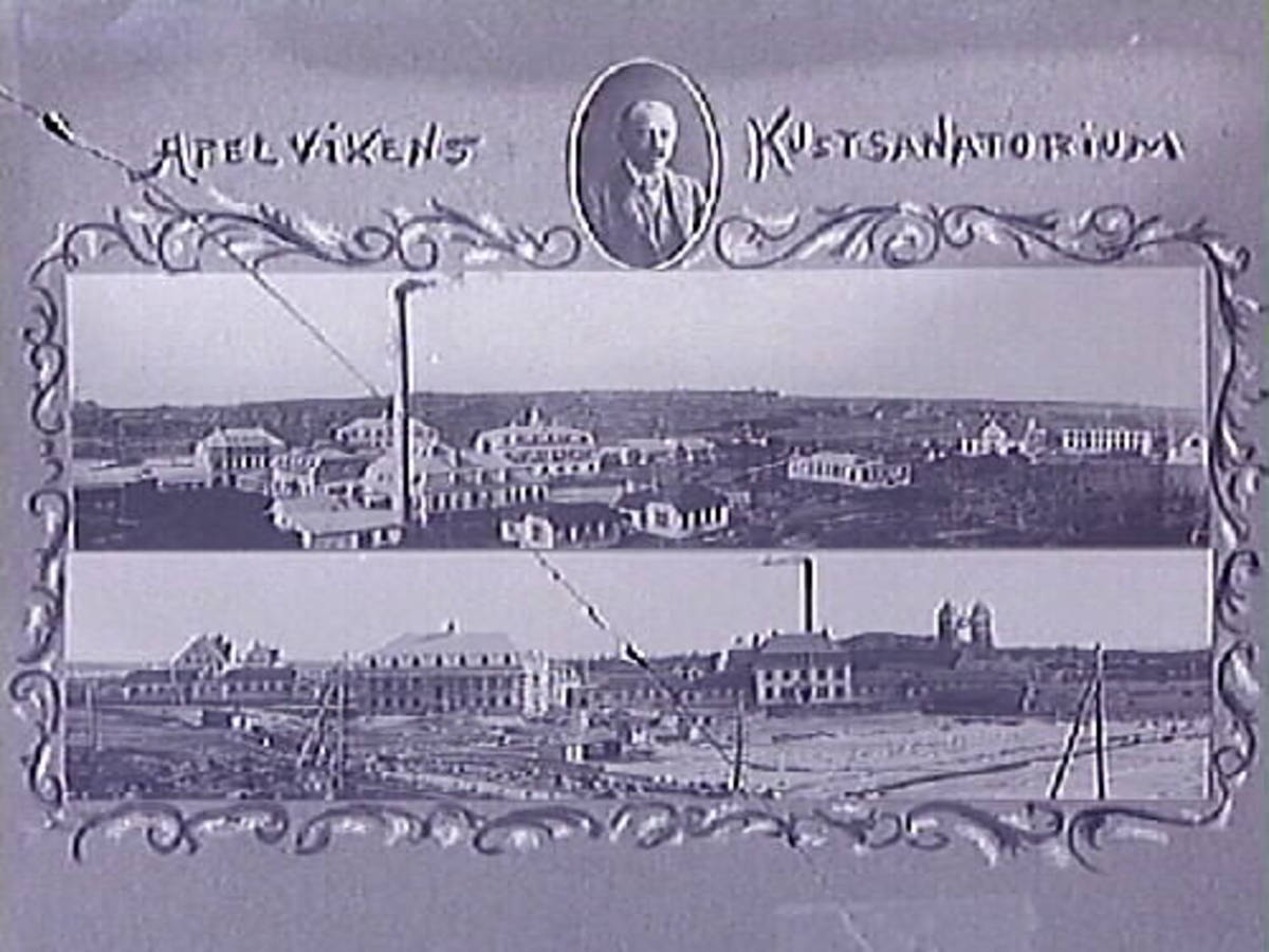 Fotomontage med två vyer över "Apelvikens Kustsanatorium" och ett porträtt av grundaren doktor Johan Severin Almer infällt i en oval ram upptill.