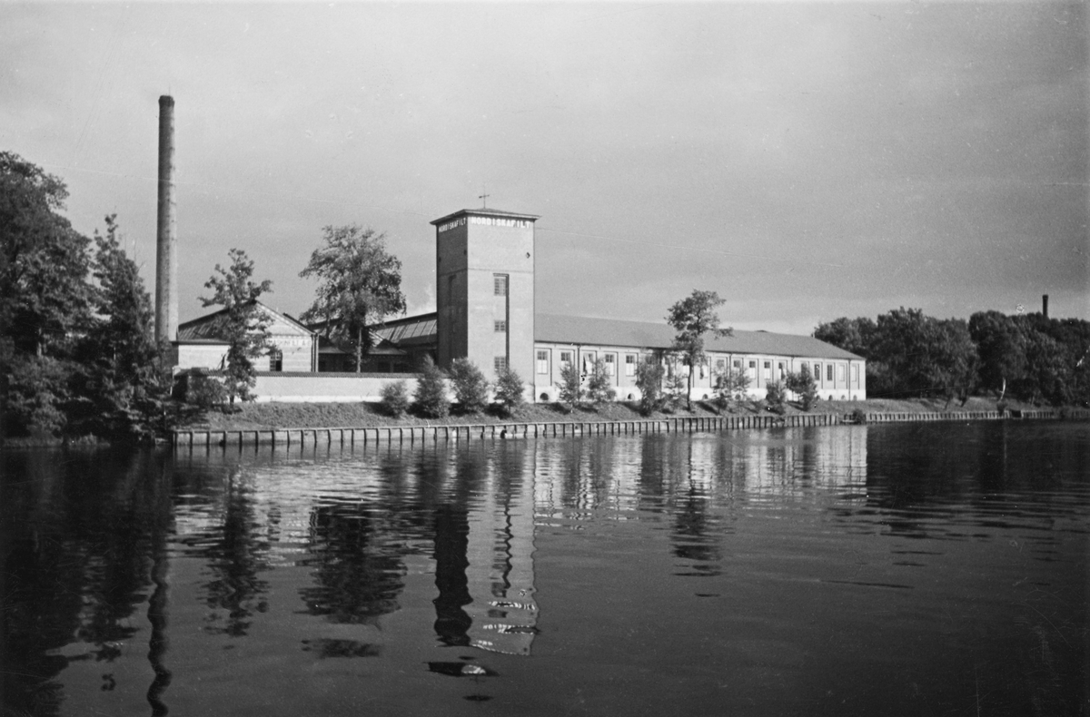 Fotografi av AB Nordiska Filtfabriken i Halmstad vid Nissans östra strand. Nordiskafilt AB startades 1904 som ett familjeföretag under namnet Nordiska Maskinfilt AB av Robert Kanth och Gustaf Adolf von Reis den yngre (handelsresande vid Wallbergs Fabriks AB). Sommaren 1905 invigdes fabriken vid Gamletullsområdet i Halmstad och pappersindustrin var kunder.