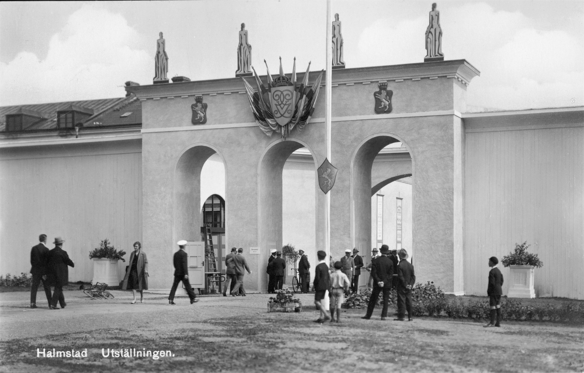 Vykort, "Halmstad Utställningen." visade entrén med tre högsmala valv. Halmstadsutställningen 1929 ägde rum 20 juni–5 augusti och invigdes av kung Gustaf V. Utställningen arrangerades på initiativ av Halmstads hantverks- och industriförening i syfte att visa upp vad Halland hade att erbjuda inom hantverk, industri och konst. Utställningsområdet byggdes upp kring Högre Allmänna Läroverket som en ny trästad och arkitekt var Uno Forthmeiier. Läroverkets salar användes för utställningar. På annexets vindsvåning visades den moderna halländsk konsten och de sex deltagande konstnärerna bildade därefter Halmstadgruppen. Nöjesfält och utskänkningsställen fanns på området som kvällstid lystes upp av 5000 lampor. Stadsträdgårdsmästaren Gunnar Svensson hade anlagt grönområden och rabatter. Staden passade också på att marknadsföra sig som en badort tillsammans med Tylösand för att locka turister.