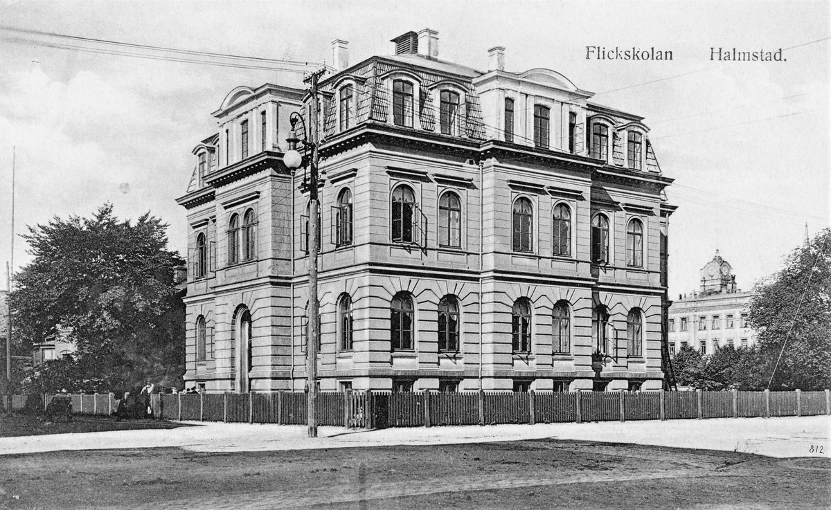 Brevkort, "Flickskolan - Halmstad." Efter att ha hyrt lokaler sedan 1875 fick flickskolan1889 en nybyggd egen skolbyggnad, ritad av arkitekt Knut Beckeman. Han var stadsarkitekt i Halmstad 1884–1890 och ritade även stadens varmbadhus. Flickolan hade i sina två våningar 12 lärosalar, bönsal och gymnastiksal. Men elevantalet ökade med åren såpass att man 1905 byggde på ytterligare en våning, vilket ses på bilden.