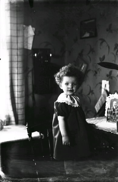 "Maj-Britt i 'Smean' född 1929." Flickan står på en stol i ett rum med stormönstrade tapeter och en väggtelefon.