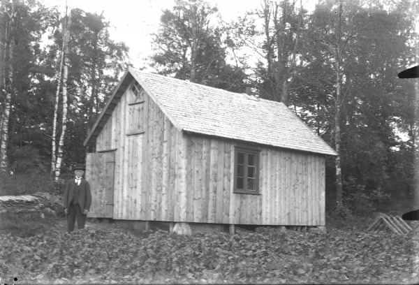 En man står vid en ny mindre byggnad med dörr och vindslucka på gaveln och ett stort fönster på långsidan. I förgrunden en åker, troligen med potatis.