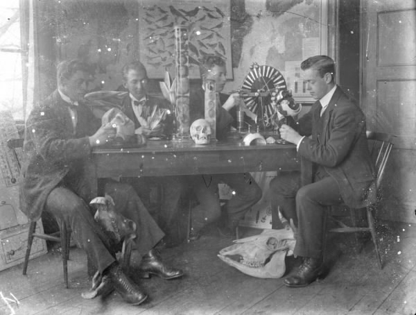 Fyra ynglingar runt ett bord där de arrangerat sig som "vetenskapsmän" med skilda instrument, kranier - varav ett på golvet biter i den enes ben - och på väggarna skolplanscher med fåglar och kartor.