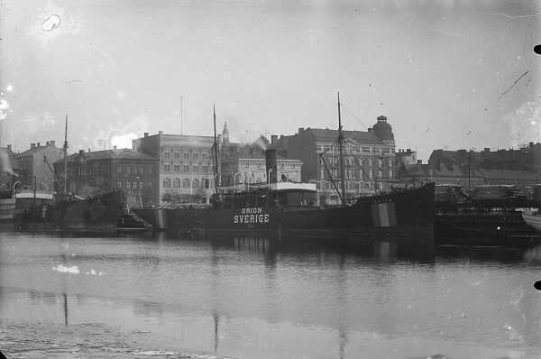 Ångfartyget Orion ligger vid kaj, där tågvagnar med virke står. I bakgrunden stadsbebyggelse.