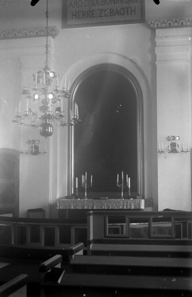 Kyrka, interiör av koret med altarring och altare inramat av ett högt rundbågat valv. Däröver står en text som avslutas med Herre Zebaoth. Vid främsta bänken ett lågt korskrank. Endast stearinljus i ljuskrona, lampetter och ljusstakar, så kyrkan har inte fått elektricitet ännu.