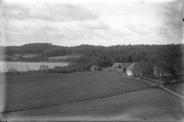 Foto taget ovanifrån över en lantgård med åkrar som ligger nära sjön.