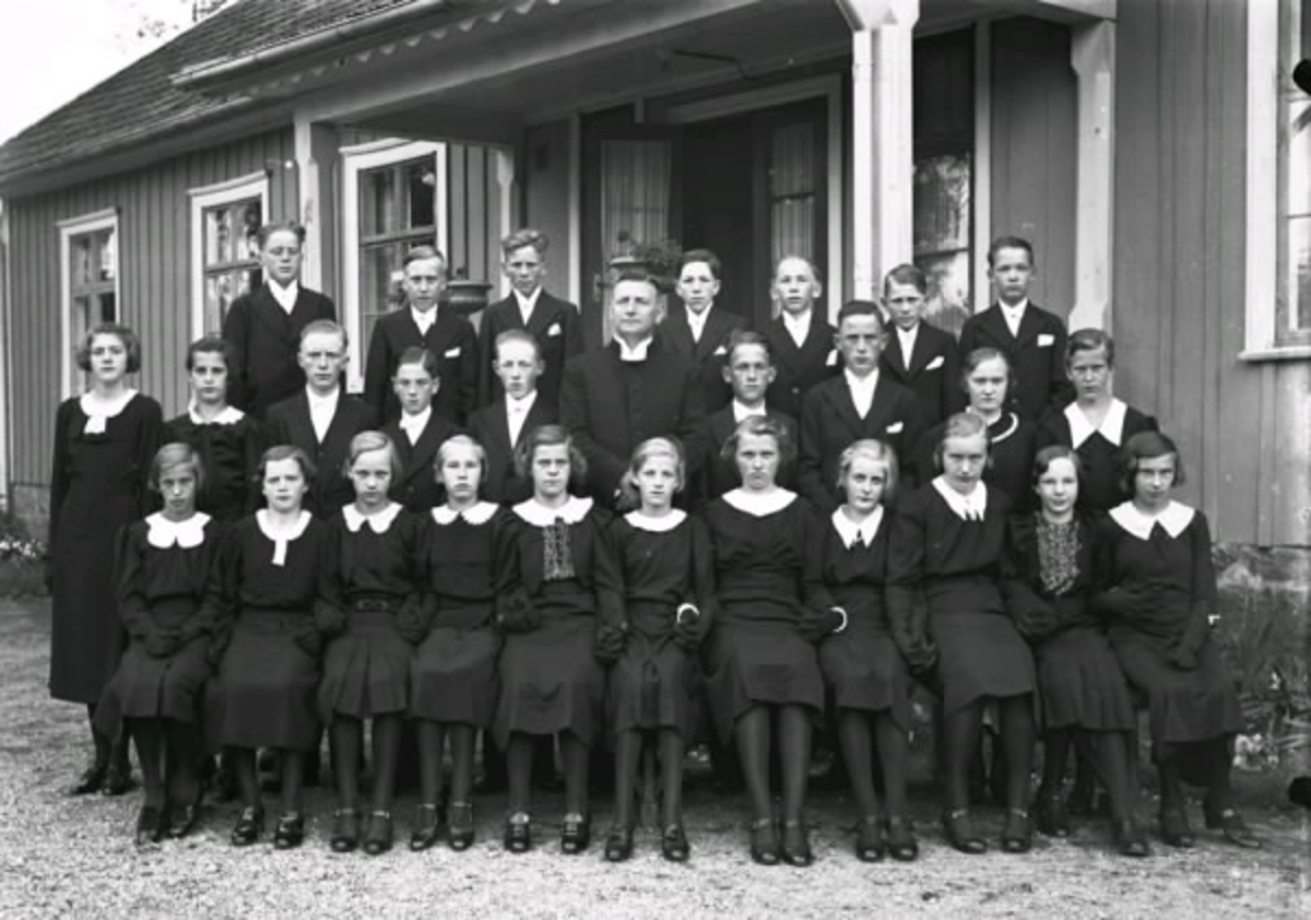 Konfirmandgrupp. Karl-Erik Jansson, Lennart Elmqvst, Bo Kristensson, Alvar Bernström, Inger Karlsson, Maj-Britt Nyberg, Ivar Karlsson Bölstorp, Karlevik i Dämhult (Elmö), Arvid Bertilsson, Karl-Erik Gustavsson, Torsten A Långhult, Maj-Britt Nyberg, Inger i Galtabo, Karin Kristiansson.