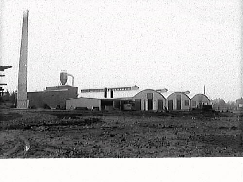 Vy över Varbergs Träförädling, snickerifabrik. Fabrikshallar med välvda tak och lanterninfönster. I förgrunden en hög skorsten.