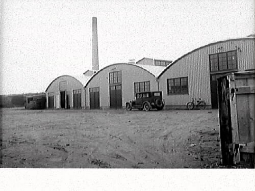 Snickerifabrik. Varbergs Träförädling. Tre välvda fabriksbyggnader med spröjsade fönster och överljus till portarna. Vid fasaden står en bil och en cykel parkerade, i bakgrunden en hög skorsten.