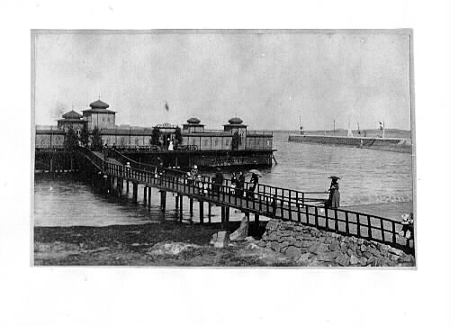 Gamla kallbadhuset i Varberg som fanns mellan 1886-1902. Många personer befinner sig på bron ut till badhuset.
