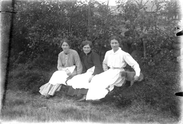 Tre kvinnor sitter i en gräsbacke med en katt eller hund vid en gärdsgård. I bakgrunden ligger en gård.