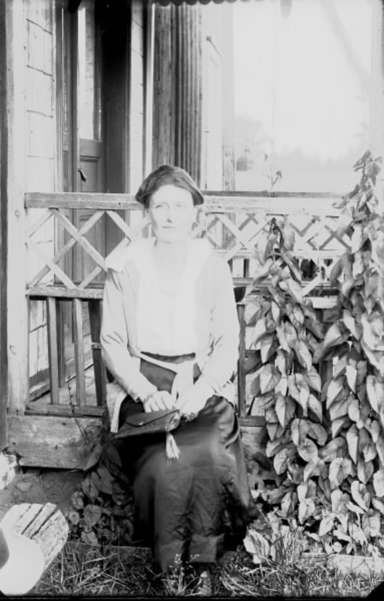 Porträtt av en kvinna som sitter på en stol framför ett verandastaket. Hon har en handväska i knät.