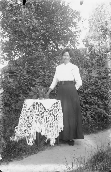 Kvinna står på en grusgång i trädgården vid ett bord med virkad duk.