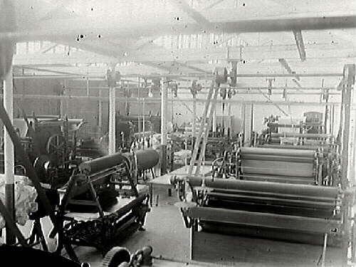 Fabriksinteriör med valsmaskiner som har remdrift. Meddela oss gärna om du har information om motivet!