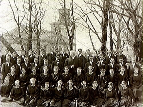 Mörkklädda konfirmander och präst med Slöinge kyrka i bakgrunden.
