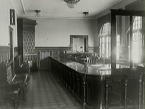 Interiör av expeditionen på Varbergs sparbank. Disken är svängd och utmed väggpanelen står bänkar. I hörnet värmer en hög kakelugn upp lokalen. Dörren i bakgrunden leder troligen in mot bankdirektörens kontor. Fönstren vätter mot torget.