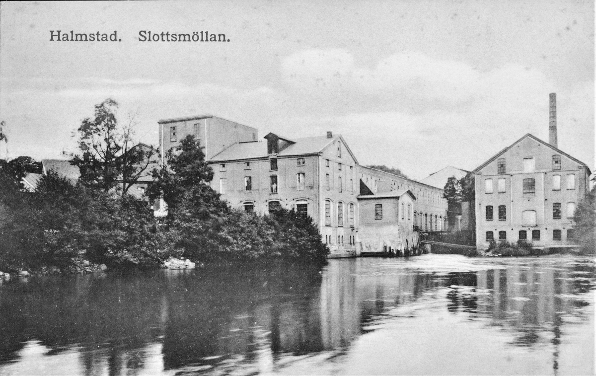 Vykort, "Halmstad. Slottsmöllan." (röd text). Bilden visar Slottsmöllans fabriksanläggning i och vid Nissan. Vid vattenfallen i Nissan nedanför Övraby anlades redan på 1600-talet en kvarn. Sedan den använts till att producera mjöl för Halmstads slotts behov uppstod namnet Slottsmöllan.