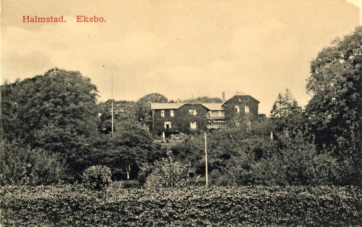 Vykort, "Halmstad. Ekebo." Villa Ekebo byggdes 1878 på Slottsmöllans fabriksområde åt fabrikören Alfred Wilhelm Wallberg (Wallbergs Fabriks AB). I samband med att han 1904 blev verkställande direktör uppfördes den norra tillbyggnaden. Där bodde han med fru och 10 barn till sin död 1930. Utifrån sitt stora intresse för kulturhistoria och passionerad samlare av gamla ting tog han initiativet till att grunda Hallands museiförening 1886, som utvecklats till Hallands Konstmuseum av idag.