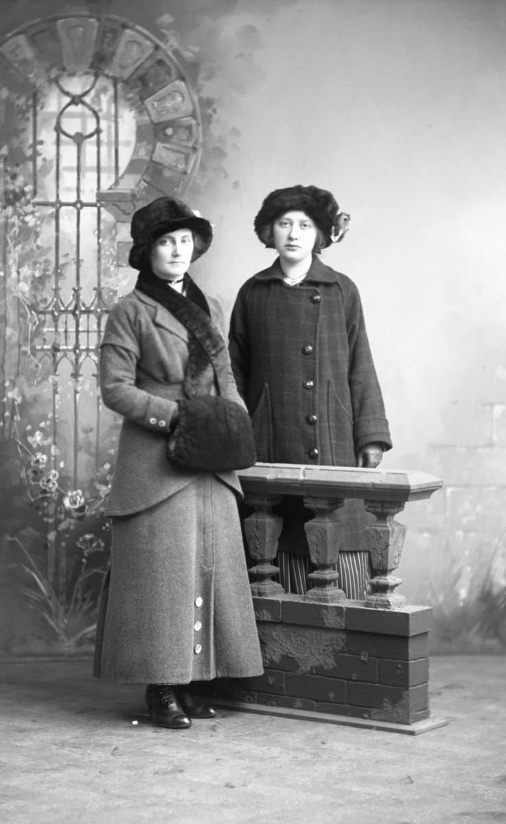 Ateljébild av två unga kvinnor stående i helfigur vid en rekvisitamur. Båda iklädda ytterkläder och pälshattar och dessutom har den ena kvinnan muff. Beställare Tekla Andersson.