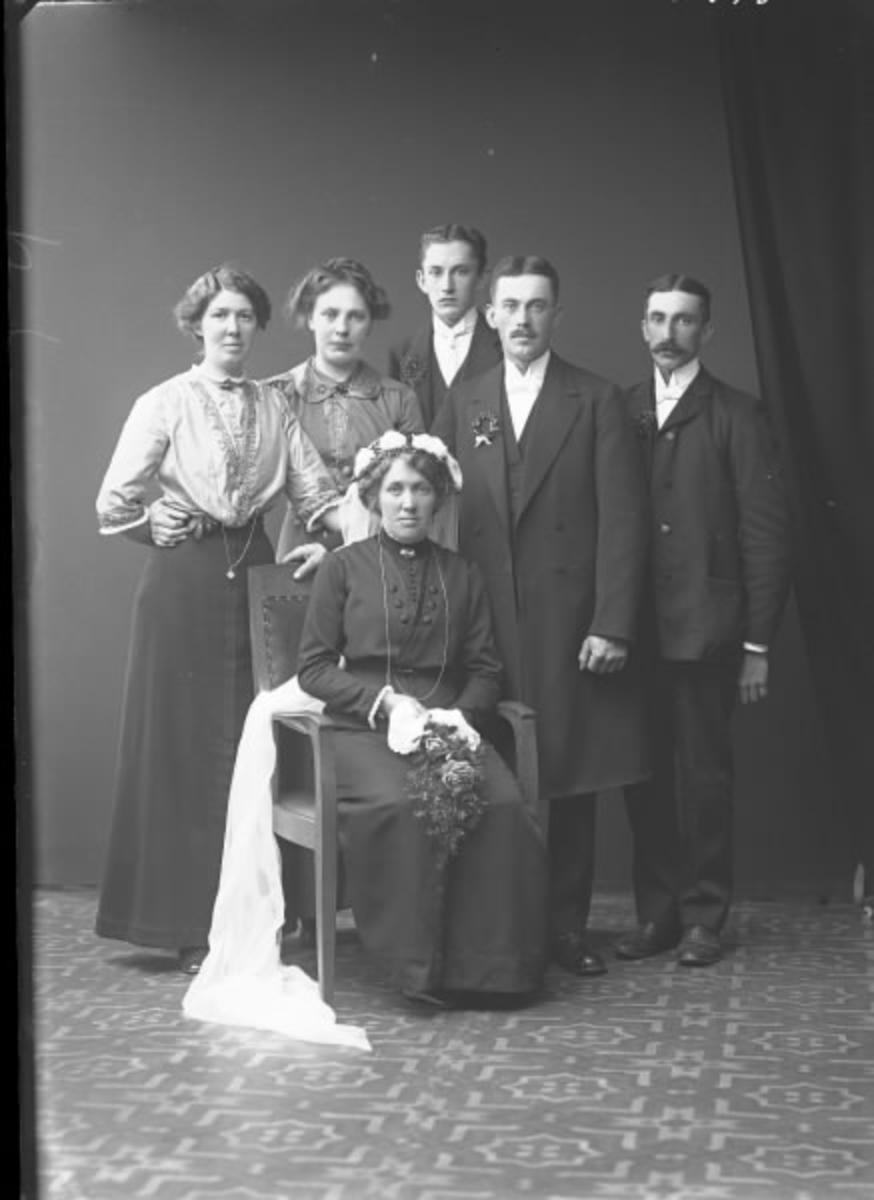 Bröllopsfoto, ateljéfoto. Brudpar och brudfölje. Bruden bär lång vit slöja och mörk klänning.