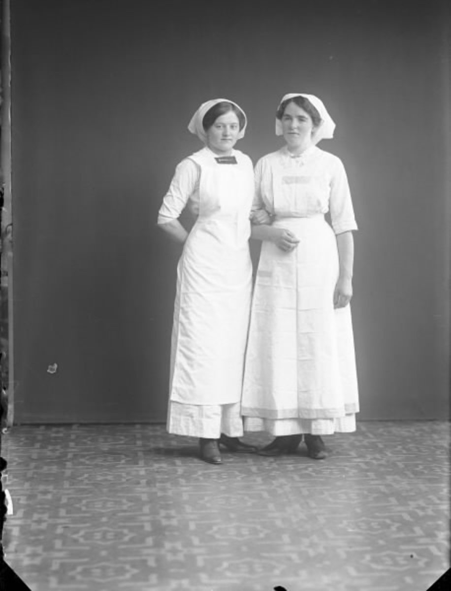 Gruppbild, kvinnor i uniform, ateljéfoto. Beställare är troligen Alma Larsson, Almeberg, Varberg.