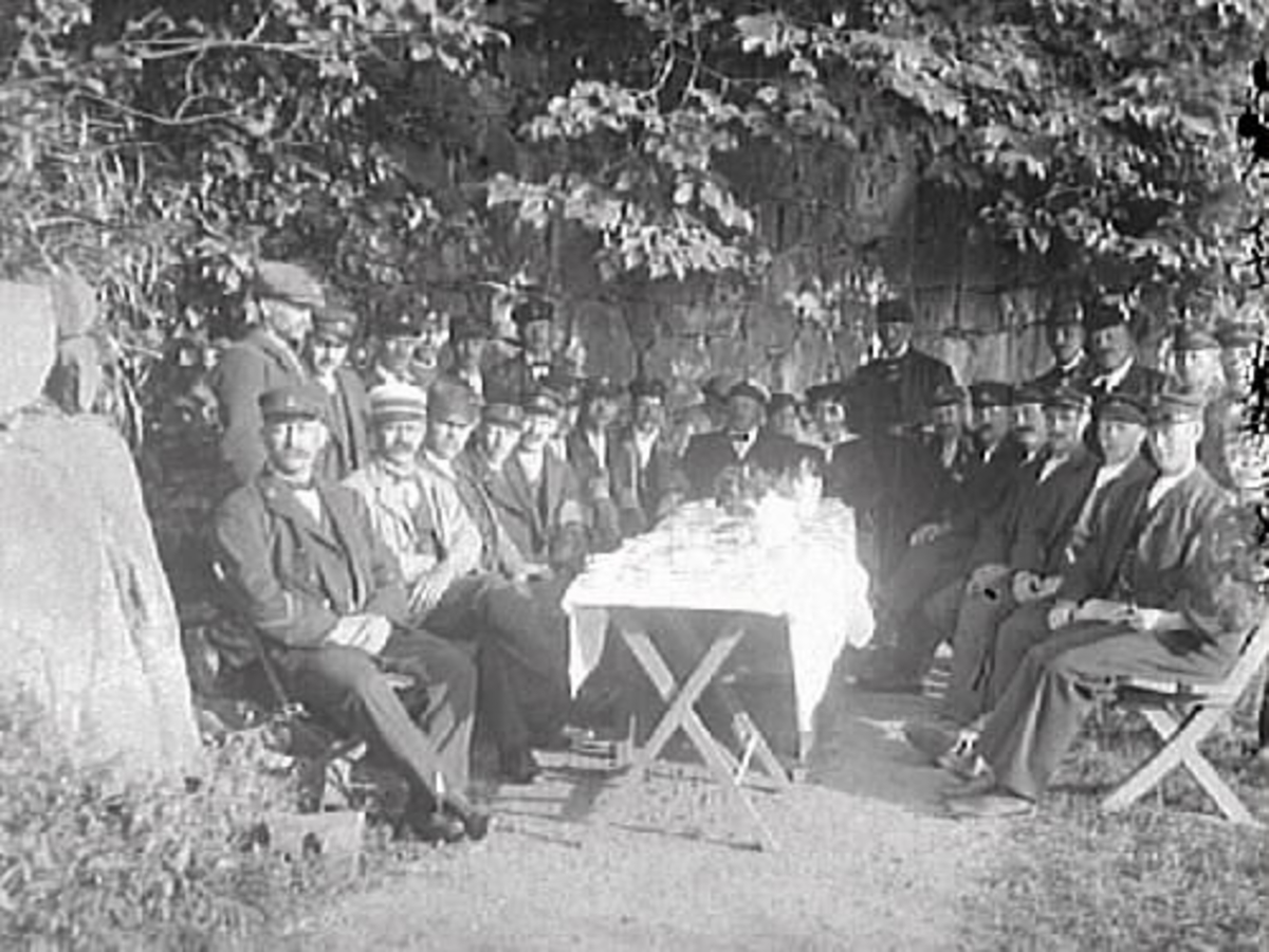 Kaffedrickande sällskap på fästningsterrassen. Männen med kors på mössorna tillhör livräddningsstationer, troligen i Halland. Övriga personer kan vara redare eller liknande som sponsrade livräddningsstationerna. Mannen som sitter längst till vänster tillhör lotsen.