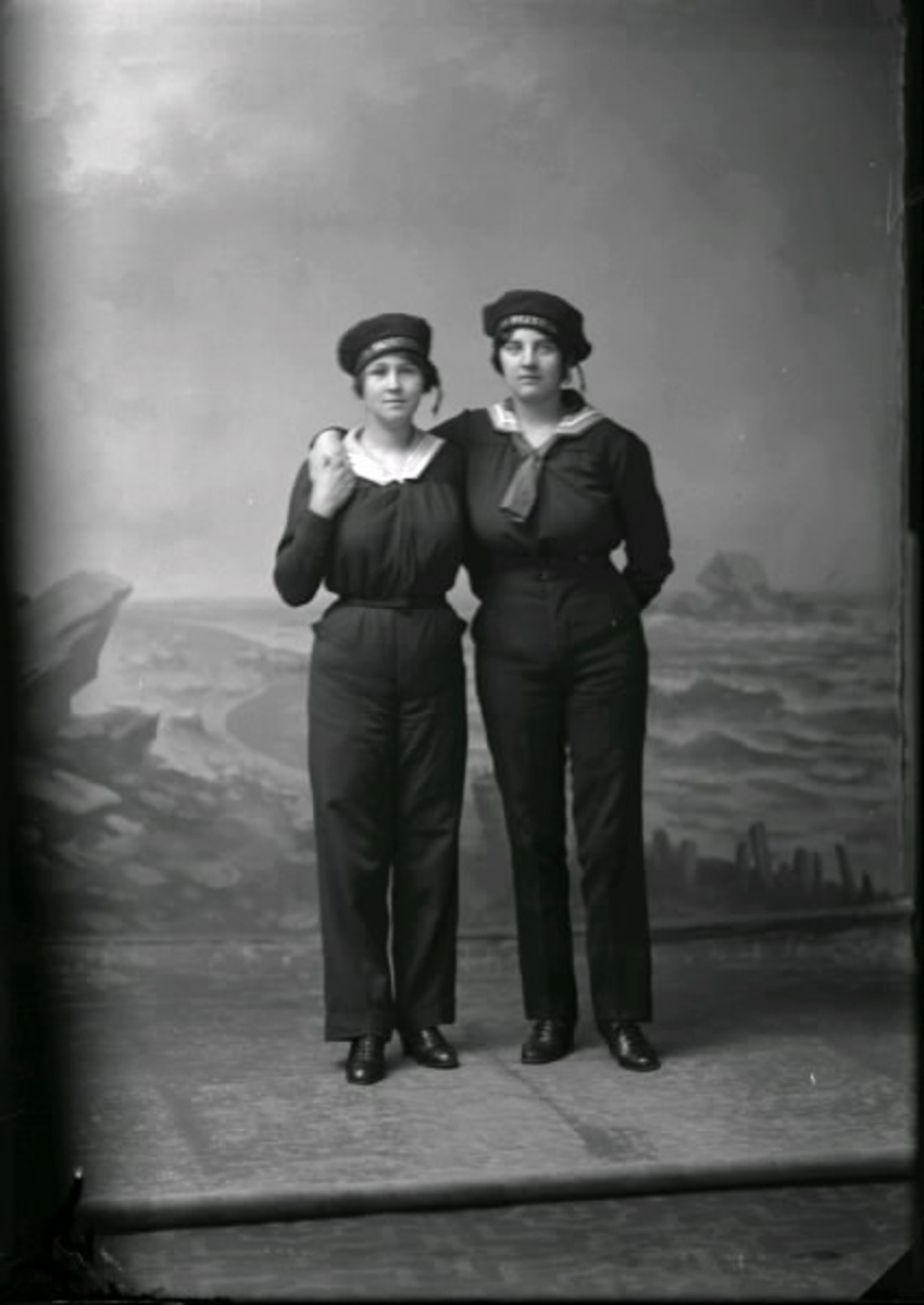 Två unga kvinnor i marina dräkter som då var på modet; här klädda i byxor och mössor. Ateljébild.