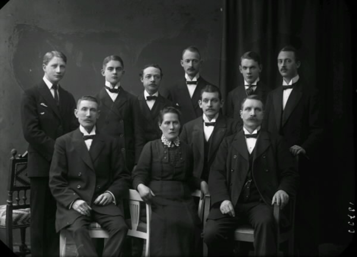 Föreningsgrupp bestående av nio män och en kvinna, ateljébild.