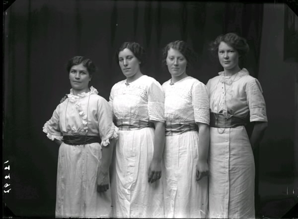 Ateljébild av fyra kvinnor (syskon?) i ljusa klänningar med breda sidenskärp; de två i mitten är likadant klädda. Beställare är Klara Larsson som står som nr 2 från vänster.