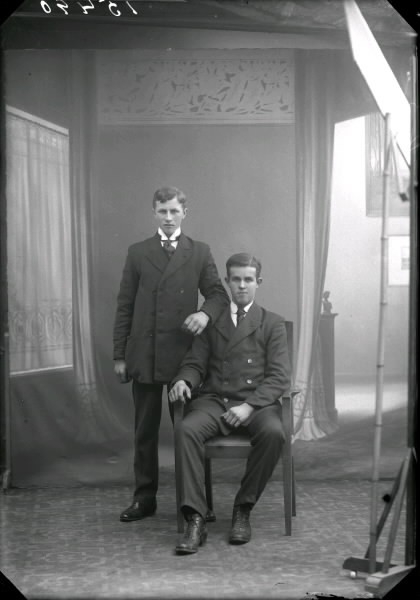 Gruppbild. Ateljébild. Bilden föreställer två (2 )män i helfigur varav den ena sitter. Beställare: Karl Johansson. Loberg.