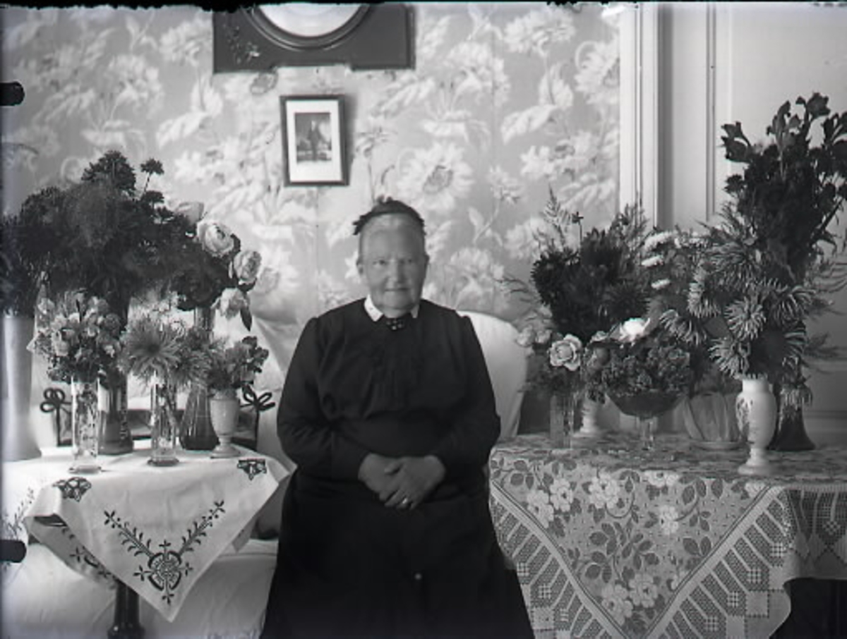 Födelsedagsporträtt av äldre kvinna. Kvinnan sitter i sitt hem omgiven av en stor mängd blombuketter i vas. Blommorna är placerade på två bord på ömse sidor om kvinnan. Vackra dukar finns på borden. I fonden tapet med stort blommönster.
