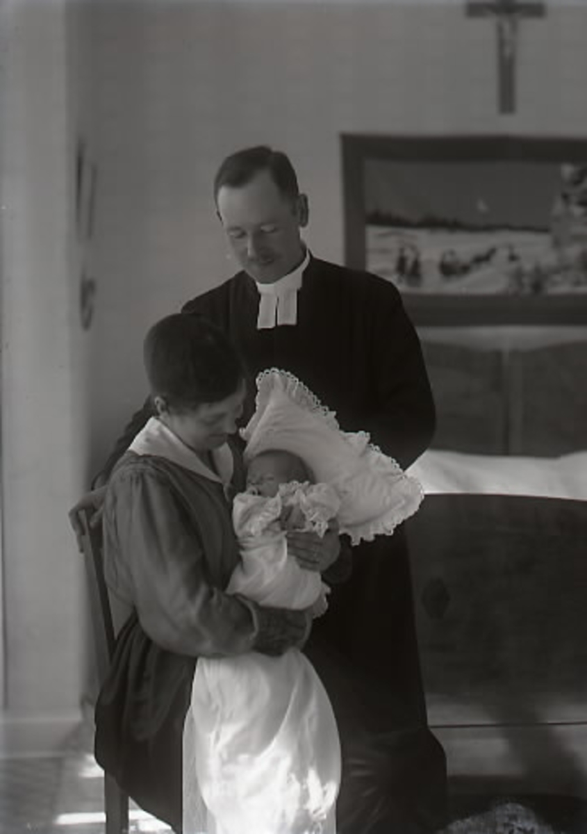 Barndop. Föräldrar och barn där modern sitter med babyn på en stol och fadern står bakom dem. Fadern är kyrkoherde och bär tjänstedräkt, barnet dopklänning. Ev. är bilden tagen i hemmet.