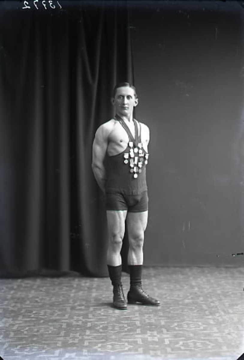 Porträtt, man stående i helfigur iklädd brottarkläder, med många medaljer på bröstet. Ateljébild.