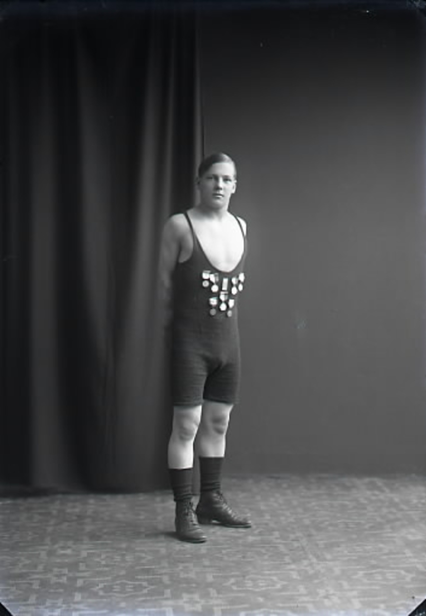 Porträtt, man stående i helfigur iklädd brottarkläder, med många medaljer på bröstet. Ateljébild.
