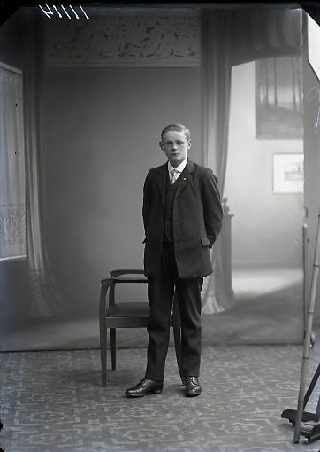 Porträtt, man stående i helfigur. Ateljébild. Beställare: Arvid Johansson. Vallby 13.